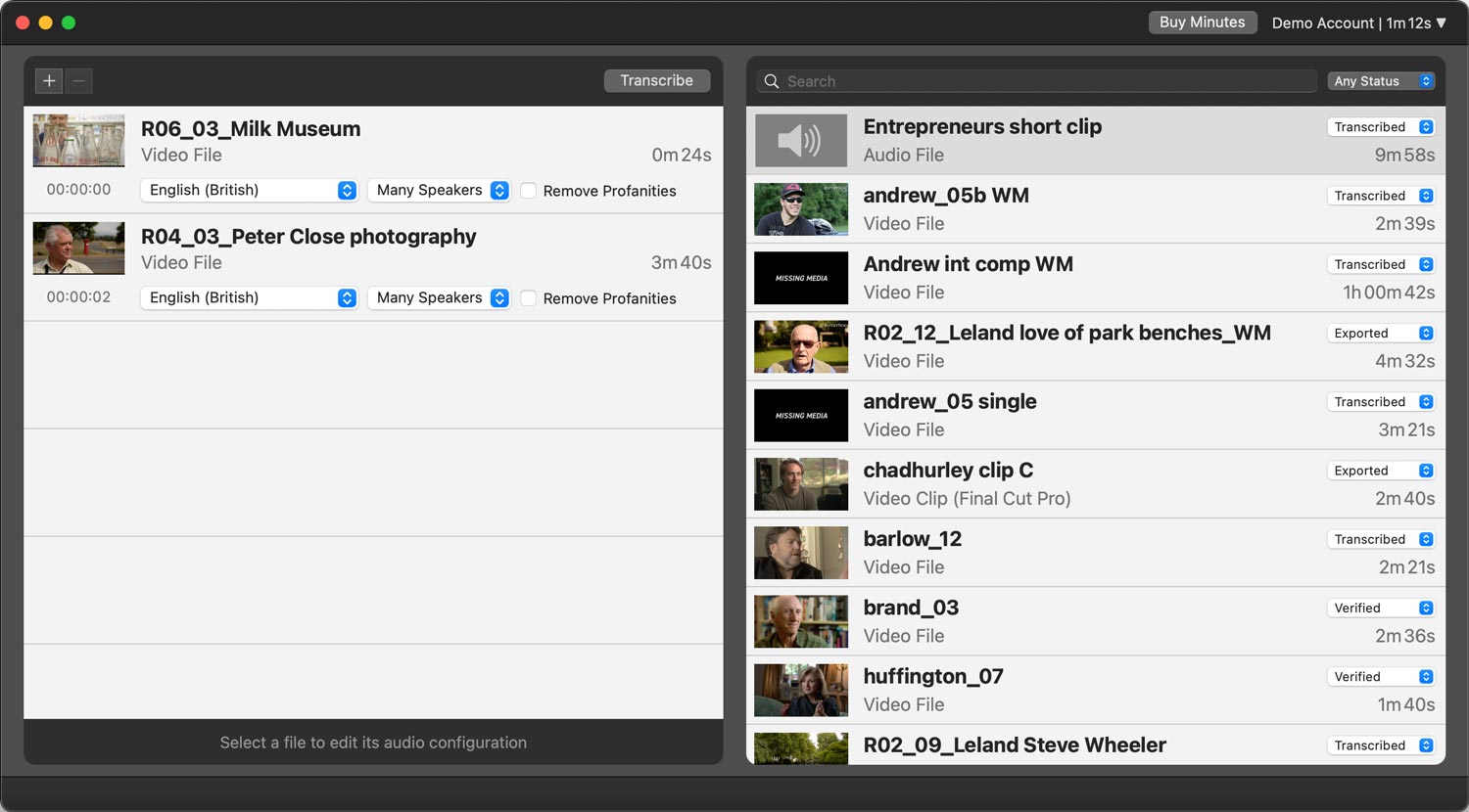 The left panel shows a list of imported files that have not yet been submitted for transcribing. The right panel shows a list of files that are either being transcribed or have already been transcribed.