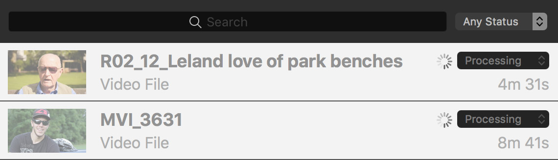 The text is dimmed and the status is shown as Processing with an animated circular progress indicator.