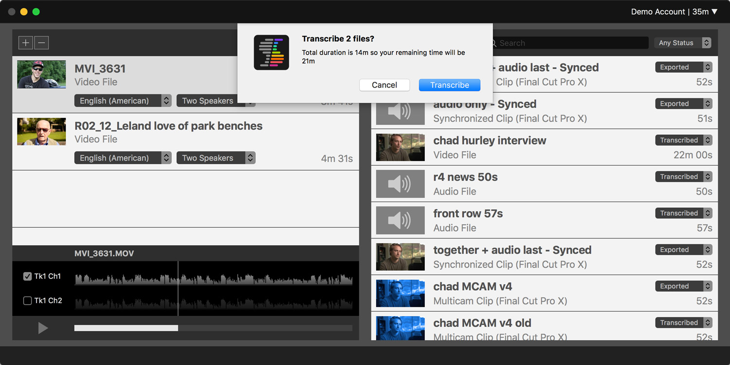 Click the Transcribe button in the confirmation message to proceed with the transcription. Each file will first be converted to an audio-only file and then uploaded to our server for transcription.