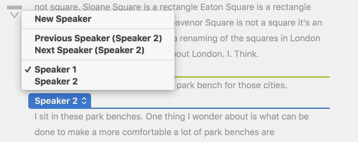 and a word is selected in the last Speaker 2 range, then doing one of the above actions will add a new Speaker 1 range on the end, since that is the previous speaker.