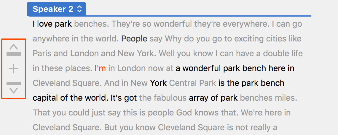 When the media file is not playing, SpeedScriber displays the speaker range controls to the left of the currently selected word.