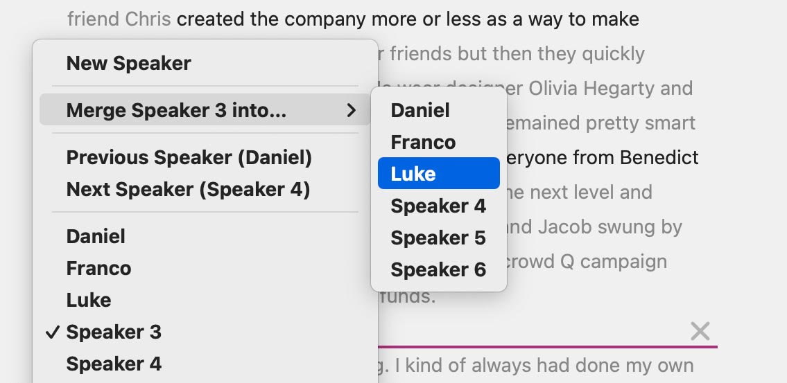 - Choose Merge [SPEAKER NAME] into… > [TARGET SPEAKER NAME]